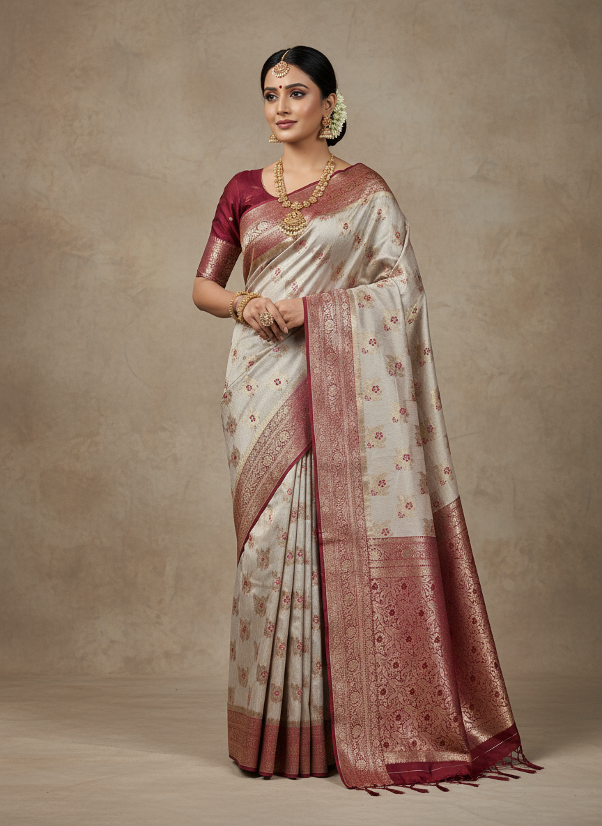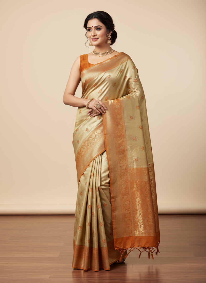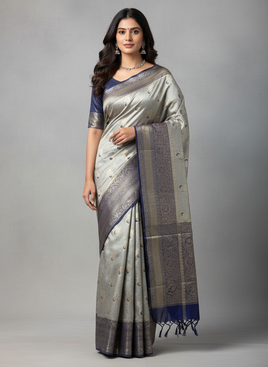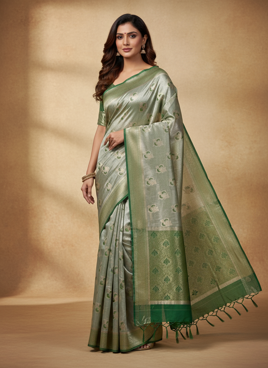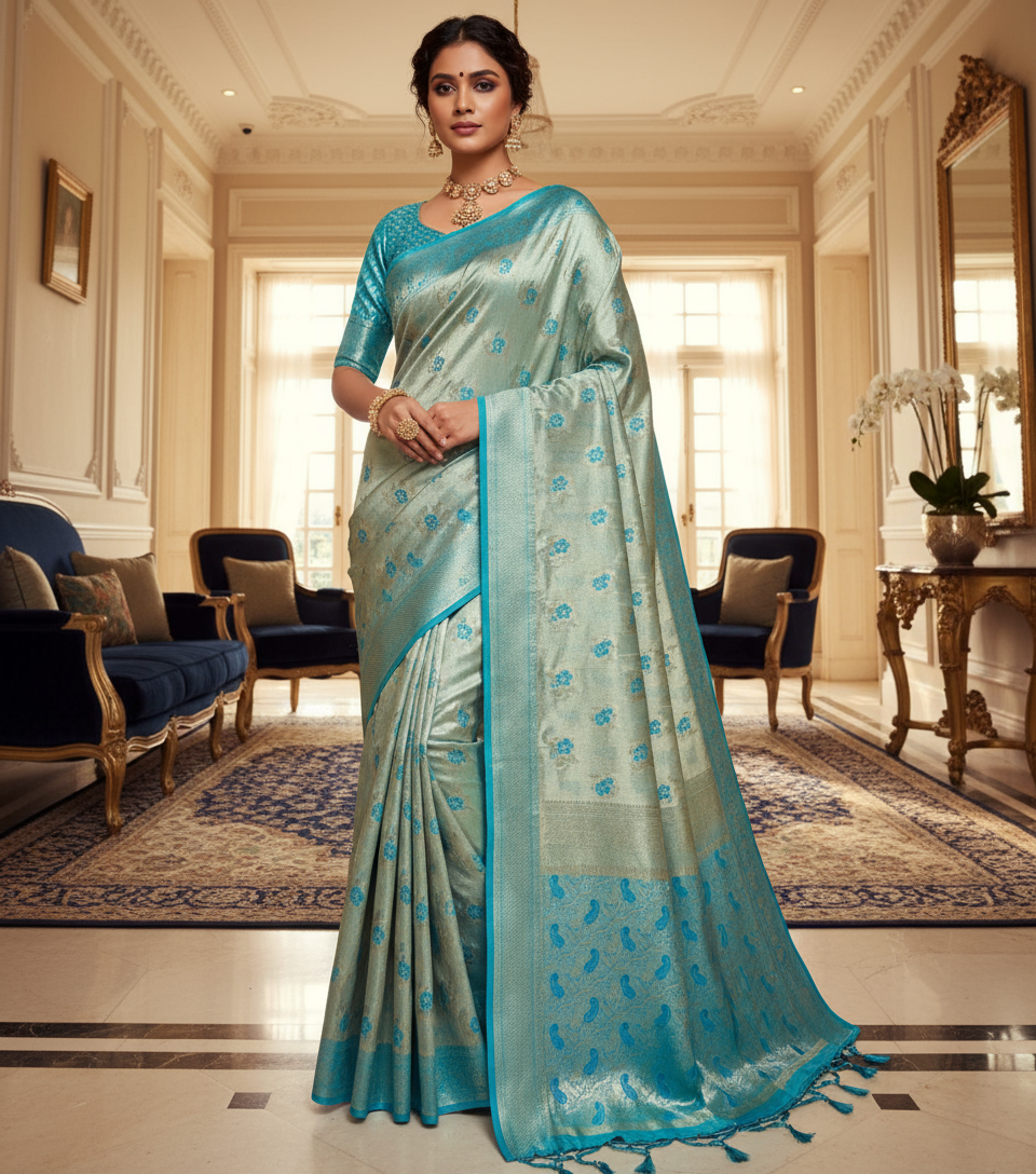 Drape yourself in sheer elegance with this exquisite Full Tissue Minakari Saree, a masterpiece of traditional artistry and modern grace. Crafted from luxurious tissue fabric, it radiates a soft metallic sheen that adds a royal touch to every occasion. The intricate Minakari weaving showcases delicate motifs in vibrant enamel-like hues, bringing life and richness to the drape.