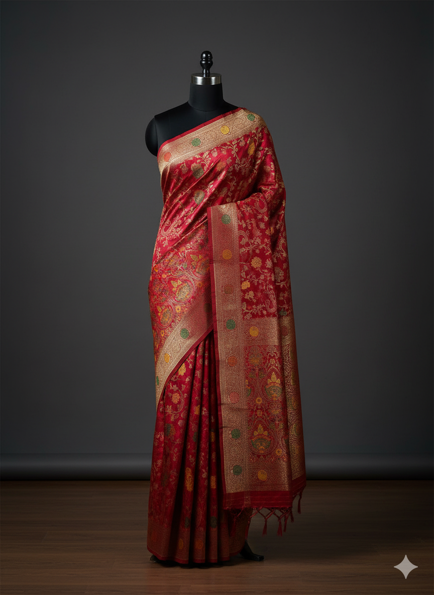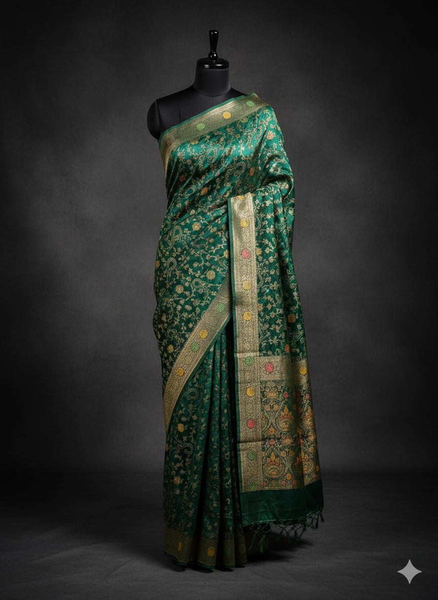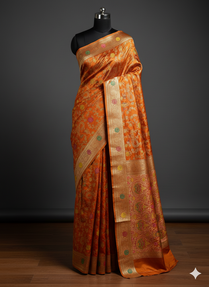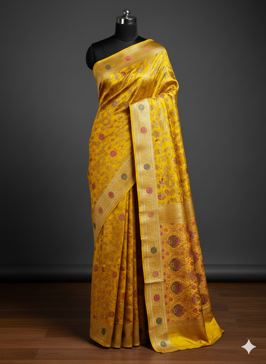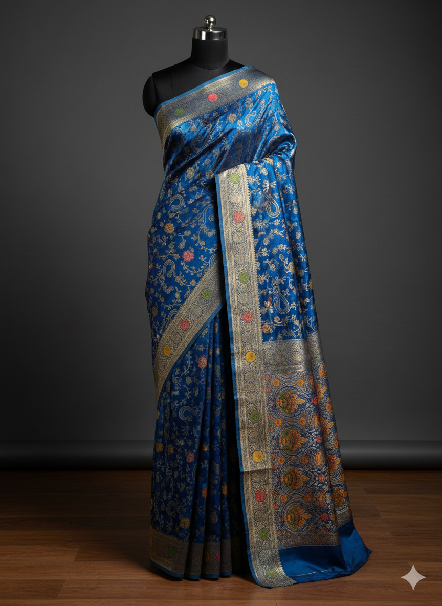 Indulge in timeless elegance with our Pure Mahsroo Saree, adorned with intricate Minakari craftsmanship. Woven from the finest silk, this saree boasts a rich, lustrous texture that drapes gracefully, reflecting sophistication and heritage in every fold.