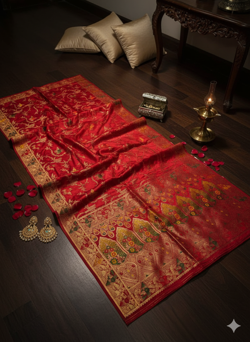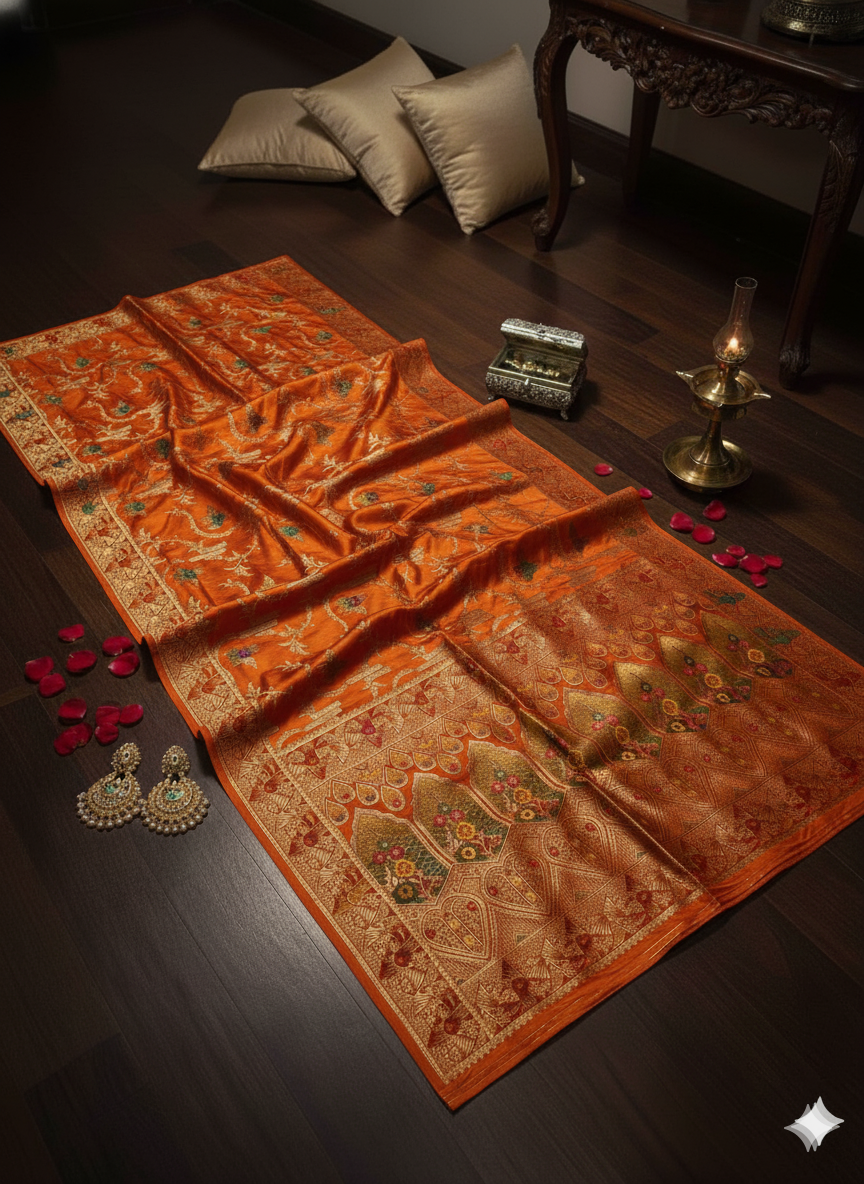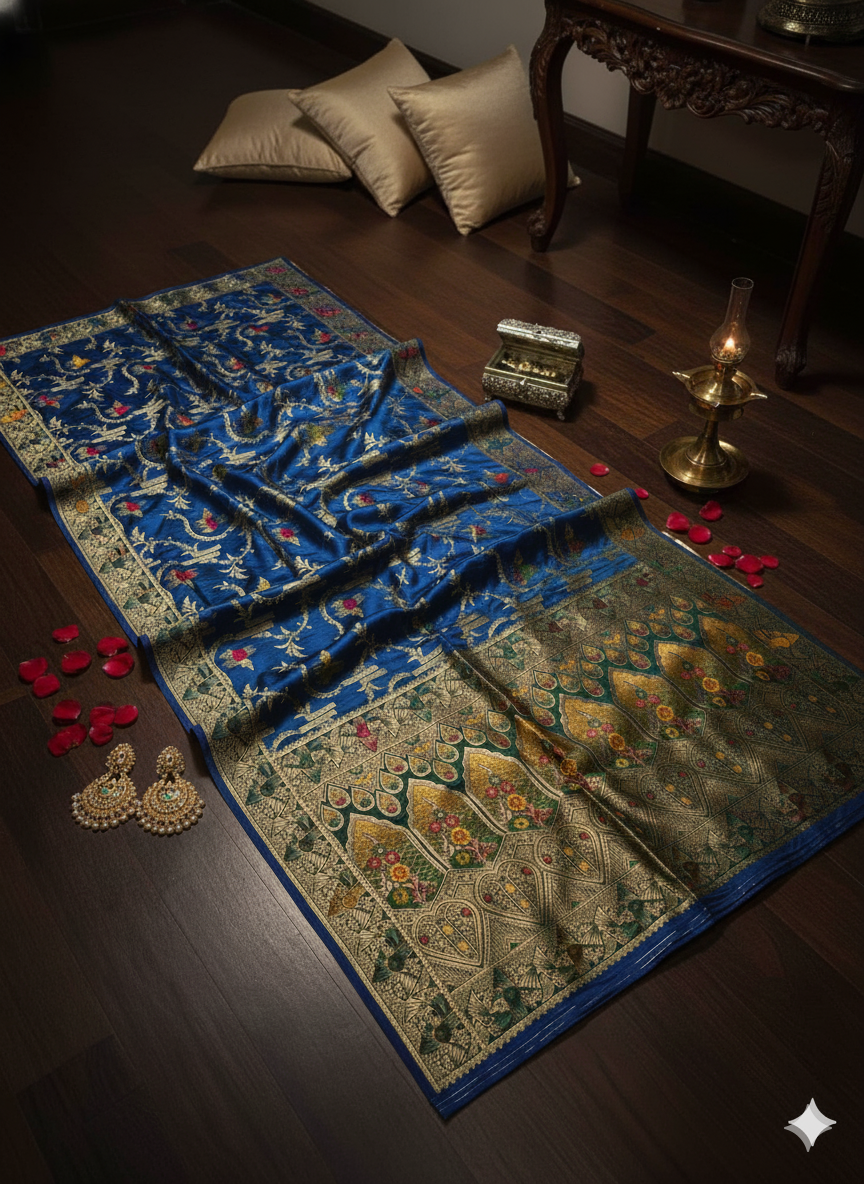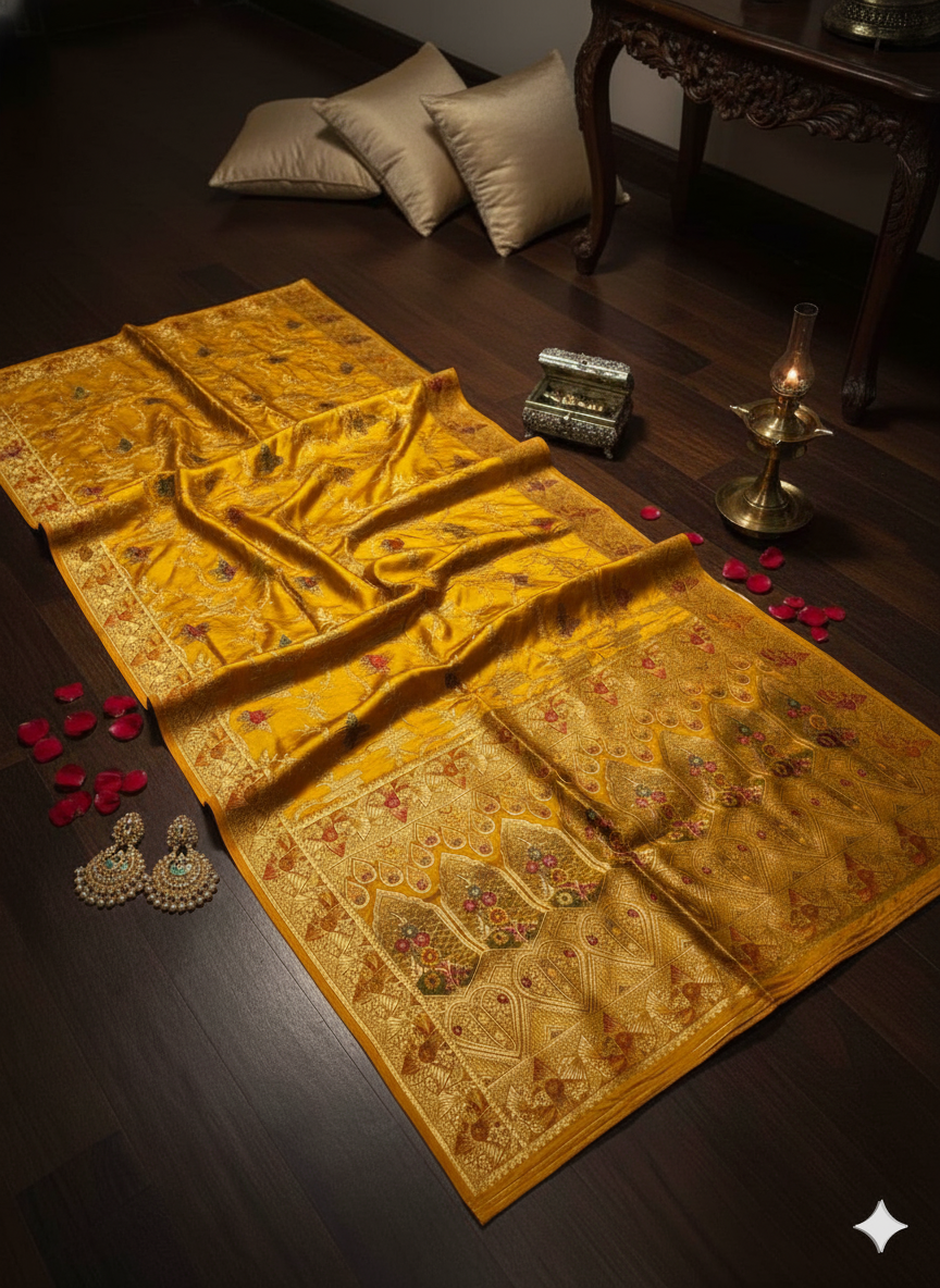 Indulge in timeless elegance with our Pure Mahsroo Saree, adorned with intricate Minakari craftsmanship. Woven from the finest silk, this saree boasts a rich, lustrous texture that drapes gracefully, reflecting sophistication and heritage in every fold.
