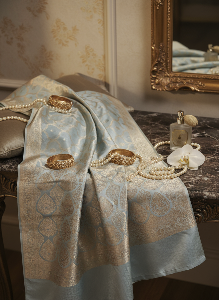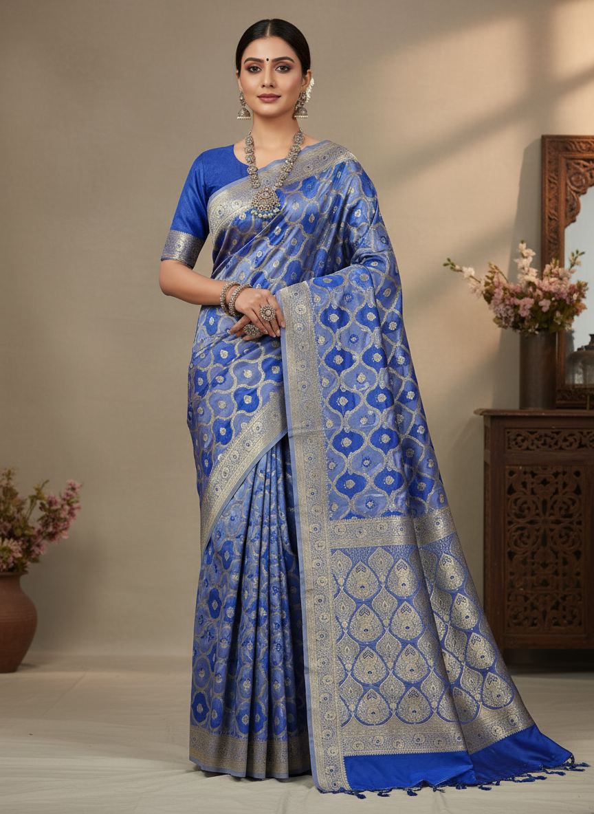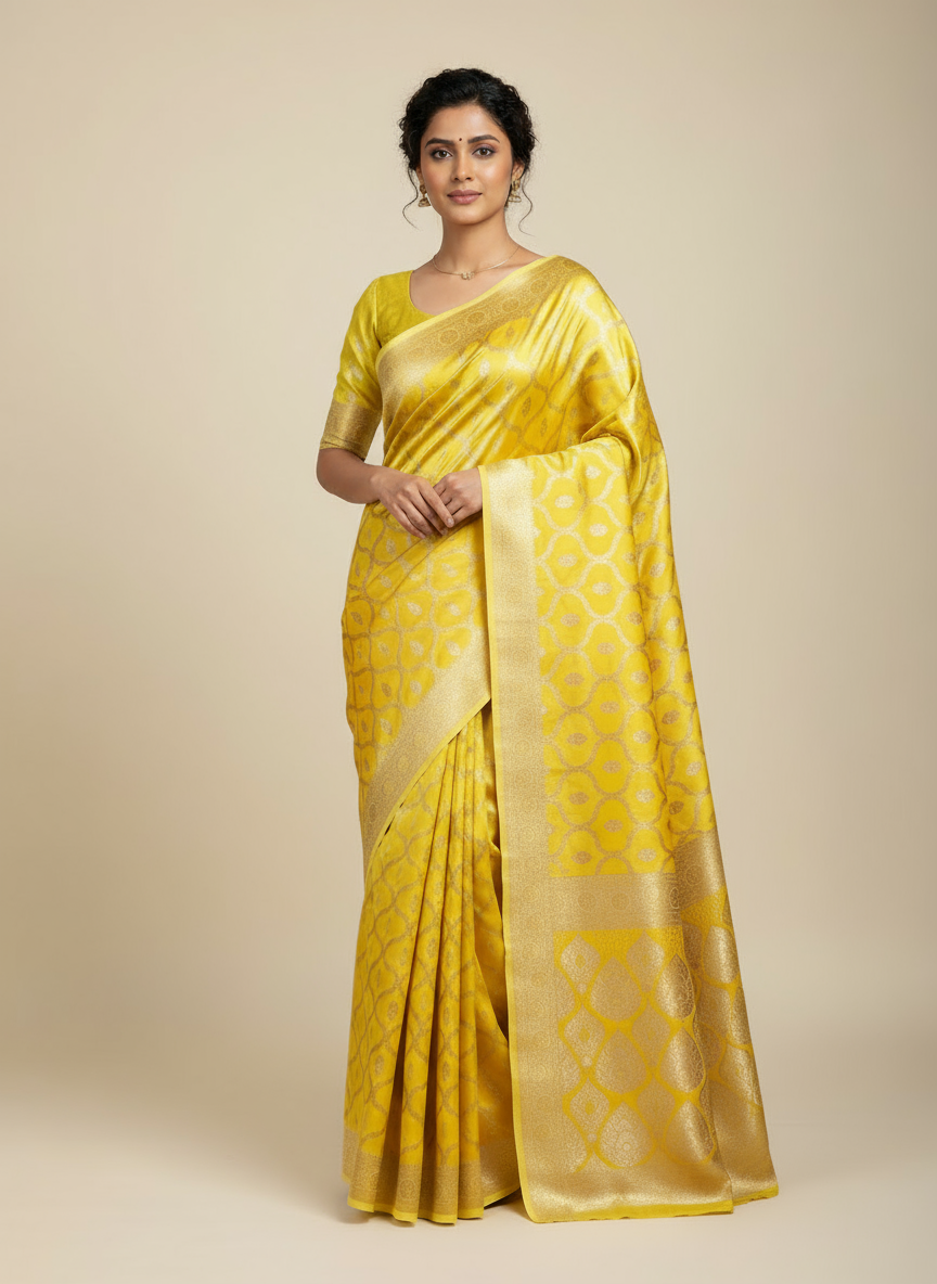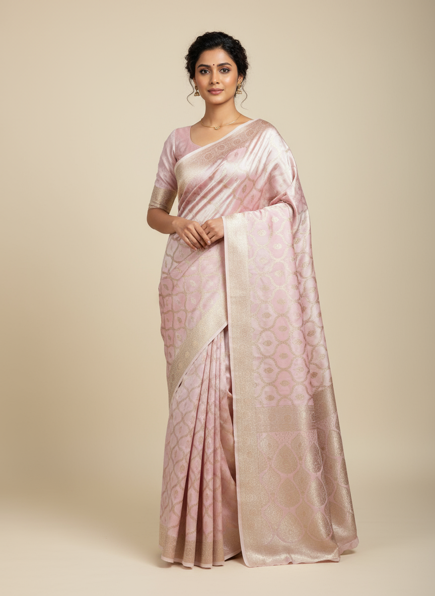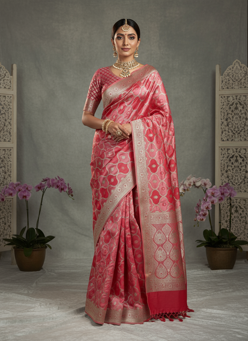 Exude timeless elegance with this Pure Mashroo Rangkat Saree, a masterful blend of tradition and sophistication. Crafted from the finest Mashroo fabric, renowned for its lightweight texture and distinctive striped weave, this saree drapes effortlessly, offering unmatched comfort and grace. The Rangkat style adds a subtle sheen and vibrant appeal, making it perfect for festive occasions, weddings, or cultural celebrations. Each saree reflects artisanal craftsmanship, with intricate patterns that celebrate heritage while remaining versatile for contemporary styling. Pair it with delicate jewelry and a chic blouse to complete a look that’s both regal and refined.
